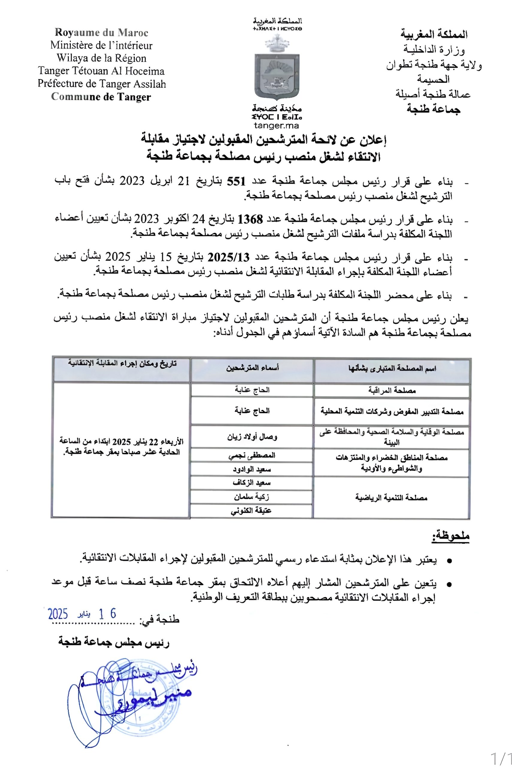 لائحة المترشحين المقبولين لاجتياز مقابلة لشغل منصب رئيس مصلحة بجماعة طنجة